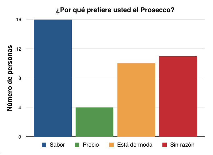 Unos 41 clientes dijeron que prefieren el Prosecco y sólo nueve dijeron que favorecen el Cava. De las cuatro personas que dijeron que no compran el cava por el precio, dos explicaron que la baratura del Cava es el motivo por no comprarlo, creyendo que el precio bajo implica inferioridad, aunque esto no es cierto. La mayoría de la gente dijo que prefiere el sabor del Prosecco. Sin embargo, lo más interesante es que diez clientes opinaron que el Cava «no está de moda».